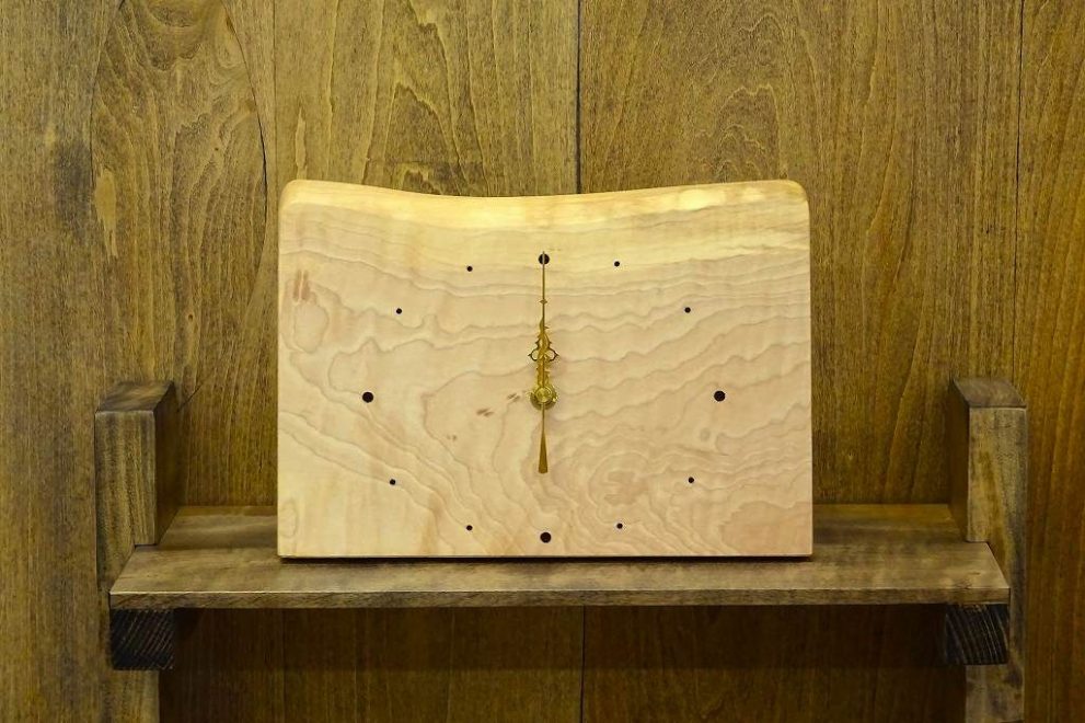 トチノキの一枚板で作った木製電波時計です。縮み杢が入っているので角度によって表情が変わります。上部は耳つきになっているので、ナチュラルな印象を与えてくれます。表面はさらっとしたマットな塗装で、木のぬくもりを感じられます。裏面の木製の棒を抜けば壁掛け時計としてもご使用いただけます。